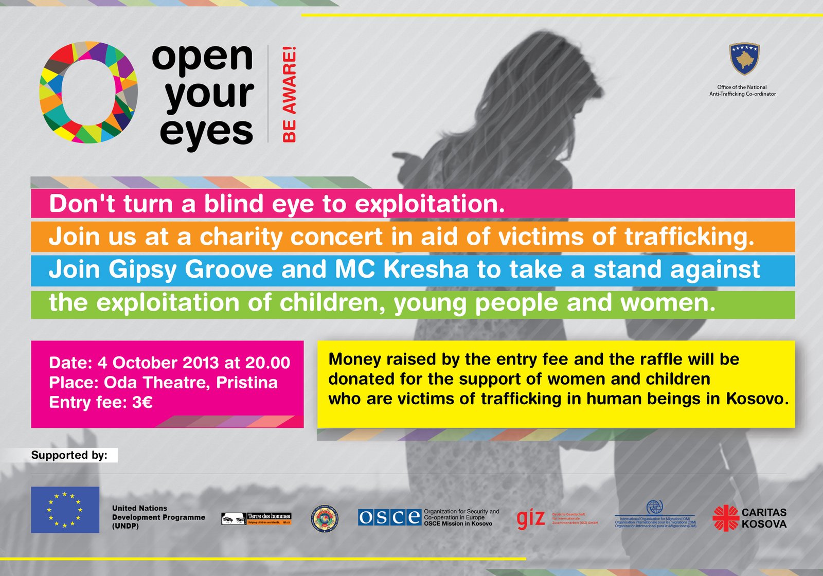 Bashkohu në koncertin bëmirës për ndihmë viktimave të trafikimit. Eja aty, kur ambasadorët e fushatës HAPI SYTË, Kafu nga Gipsy Groove dhe MC Kresha, do të performojnë dhe japin mesazhet e tyre kundër eksploatimit të fëmijëve, vajzave të reja dhe grave.