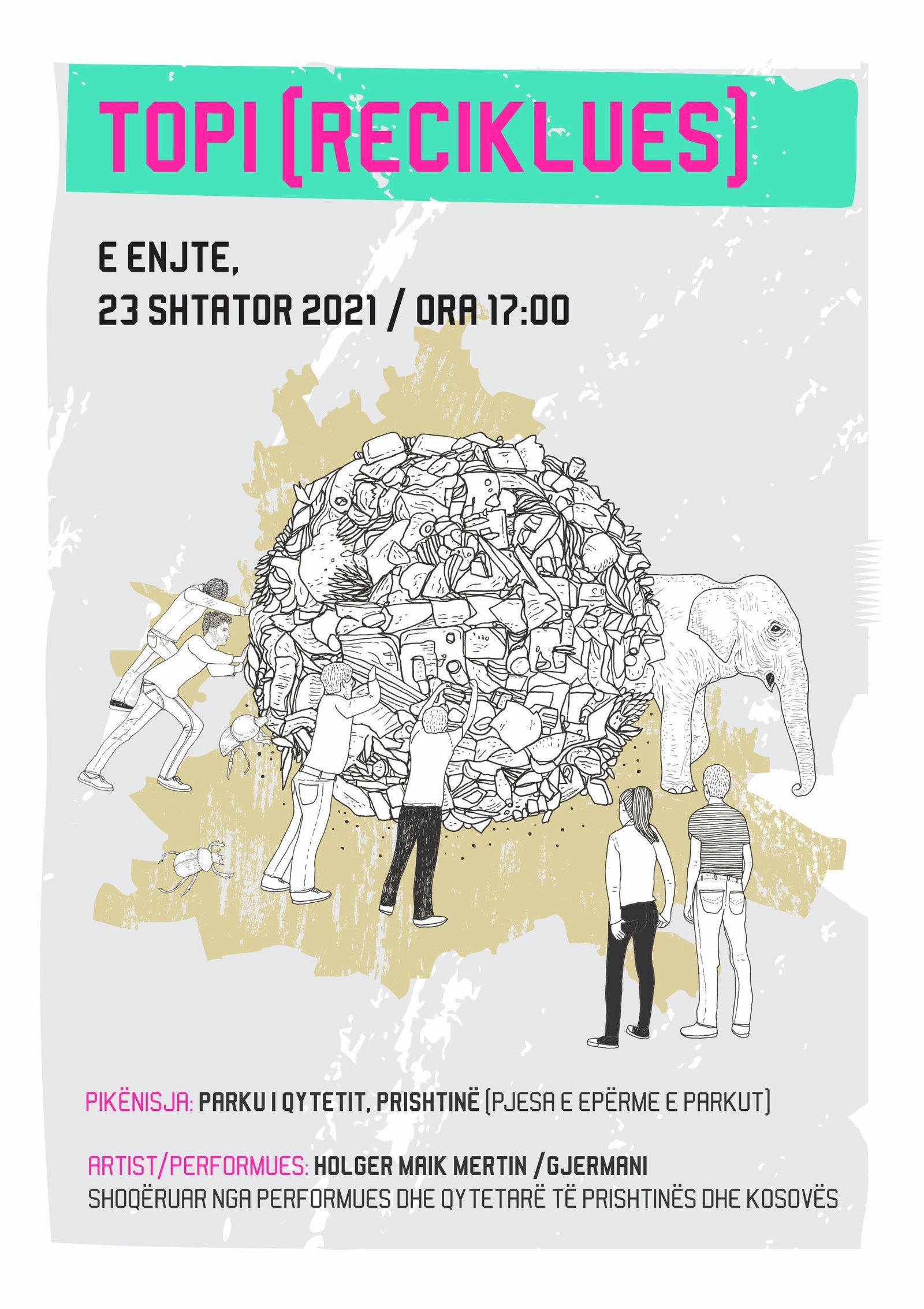 “Topi (reciklues)” merr për bazë realitetin shoqëror aktual në Prishtinë dhe botë. Është një grumbullim i mbeturinave që bashkëjetojnë me Prishtinën për t’u formësuar në një top gjigant performues i përbërë prej tepricave tona të përditshme. Duke formësuar një trajektore përbrenda shtigjeve të parkut të qytetit, topi vazhdon rrugëtimin e tij në rrugët e Prishtinës derisa të mbërrijë vendin përfundimtar në Kampusin e Universitetit të Prishtinës. Instalohet aty si një skulpturë e përkohshme në hapësirë publike duke na përkujtuar se ne duhet të vendosim një “normë” në këtë konstalacion tonin kolektiv. Dhe kjo normë është po aq e rëndësishme sa cilado normë tjetër në jetët tona. Ne jemi të rrethuar me gjëra që duket sikur janë të arsyeshme dhe që kanë kuptim. Por a është ashtu me të vërtetë? A kanë kuptim kushtet tona të jetesës? A kanë kuptim veturat? A kanë kuptim rrugët? A na çoi tutje si qytetërim ky evolucion?Vendi: Pikënisja: Parku i qytetit Prishtinë (pjesa e epërme e parkut)