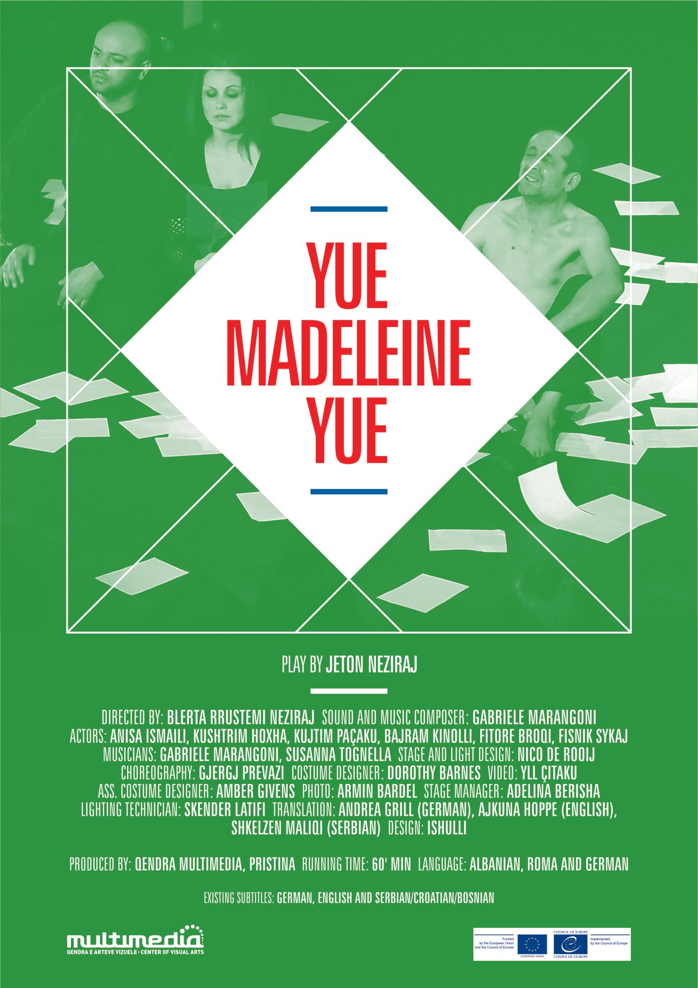 Në fokus qendror të kësaj tragji-komedi muzikore e absurdit është një familje rome, e cila ishte dëbuar me forcë nga Gjermania në Kosovë. E gjetur në një realitet të ri, kjo familje do të duhet të përballet me sfidat e një shteti të porsalindur. Një vajzë rome, Madeleine, një ditë bie në një gropë të hapur nga një kompani ndërtimi. Ndërsa vajza në gjendje kome lufton për jetën e saj, babai i saj, përpiqet të ndjekë drejtësinë, përballet me oficerë burokratike, biznesmenë, policë dhe punëtorë të ambasadës. Kjo është një dramë politike rreth Kosovës kaotike pas luftës, por, para se gjithash, është një dramë për romët e padëshiruar në Evropë. Larg nga ato stereotipet e zakonshme për romët, larg nga ai ekzoticizëm i cili zakonisht shoqëron tema për romët, “Yue Madeleine Yue” është një dramë që shkëlqyeshëm shqyrton procesin emocional që e përjetojnë mijëra romë nga Evropa, të cilët u nënshtrohen proceseve të dhunshme të riatdhesimit.